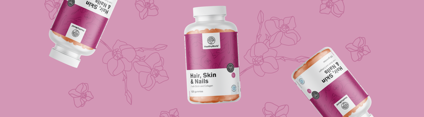 Hair, Skin & Nails so gumiji, ki vsebujejo 3 vitamine in kolagen, ki optimalno poskrbijo za lase, kožo in nohte ter hkrati:
